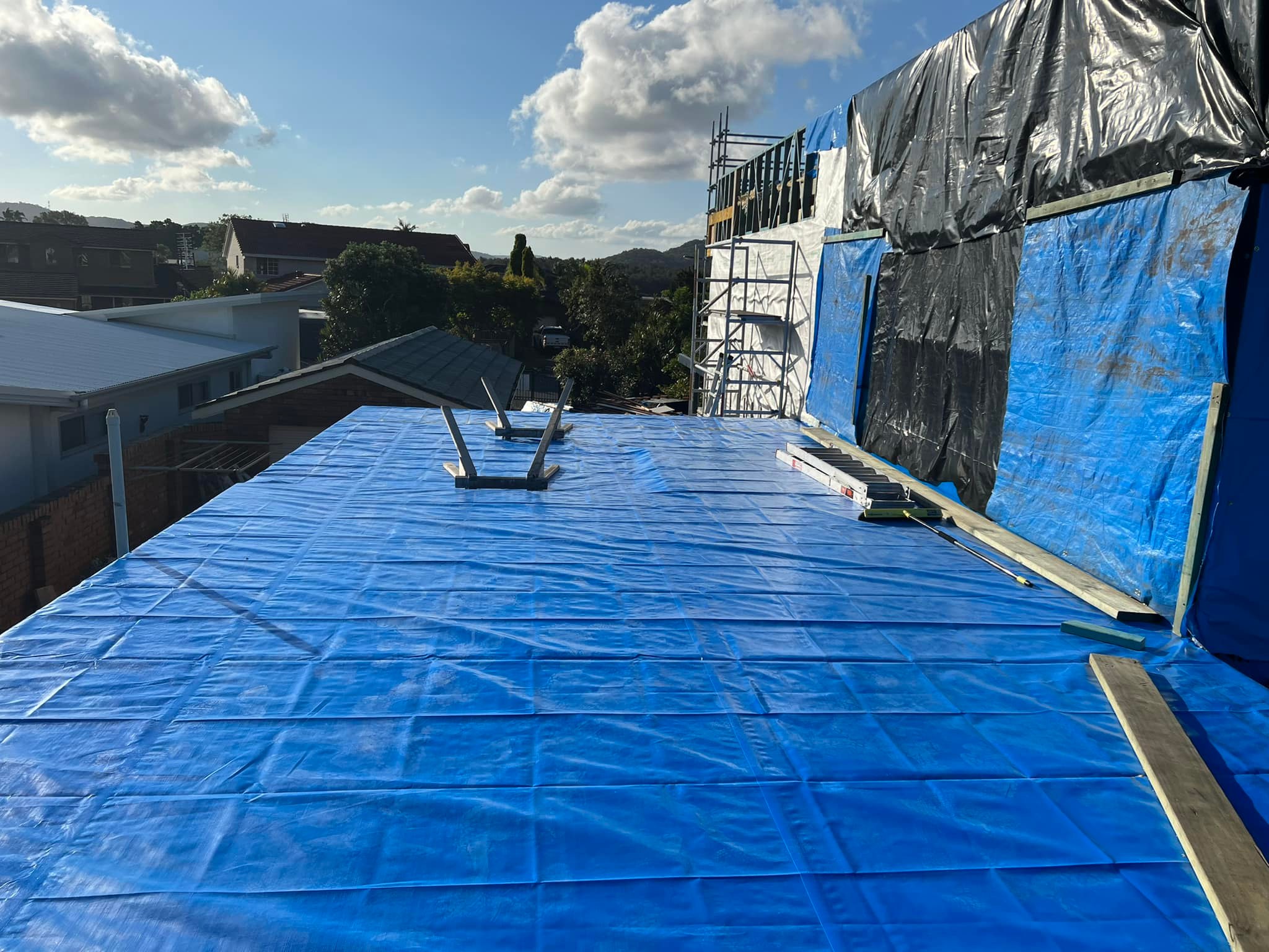 New flooring system installed and sealed under tarp for weather protection