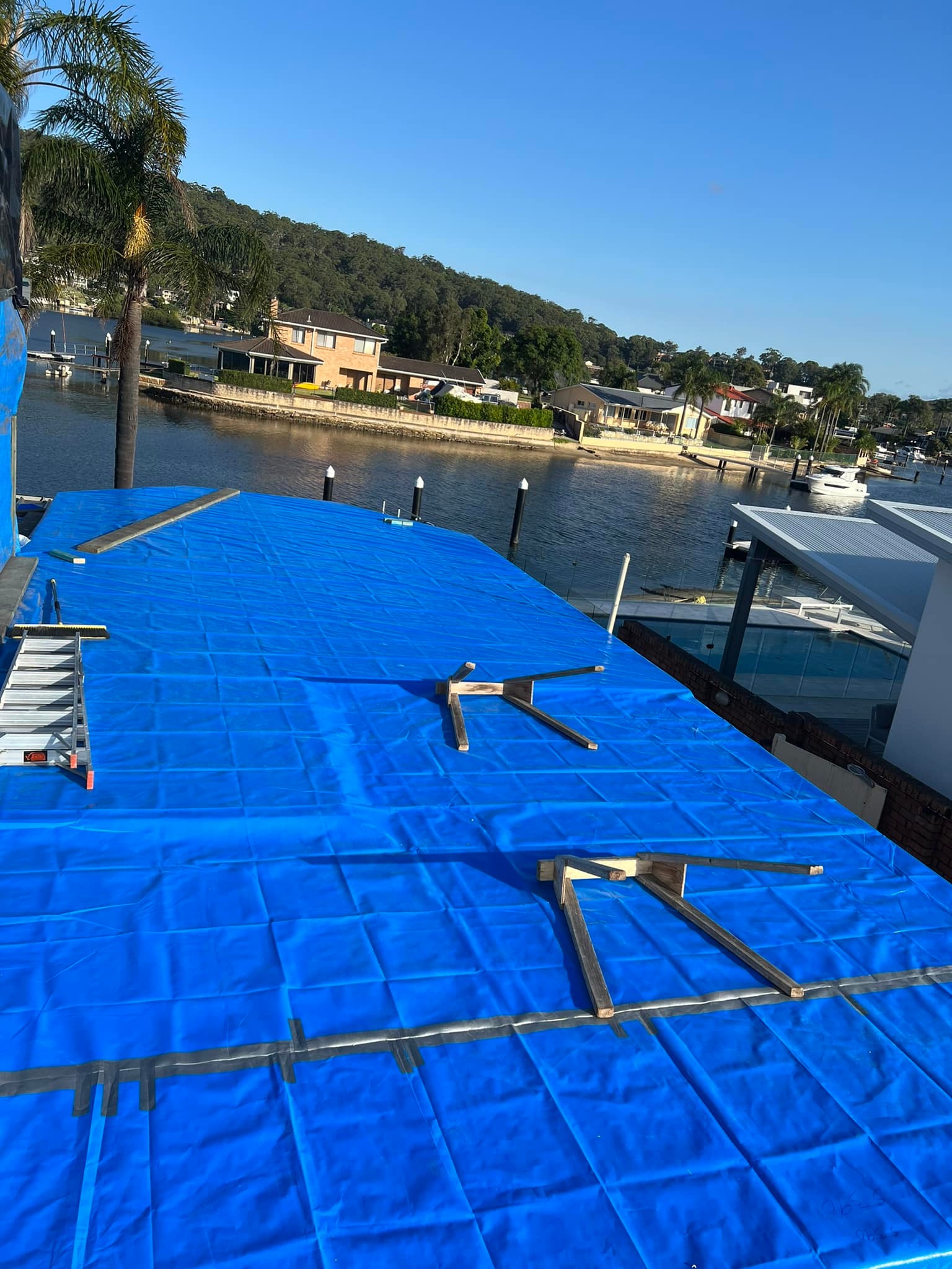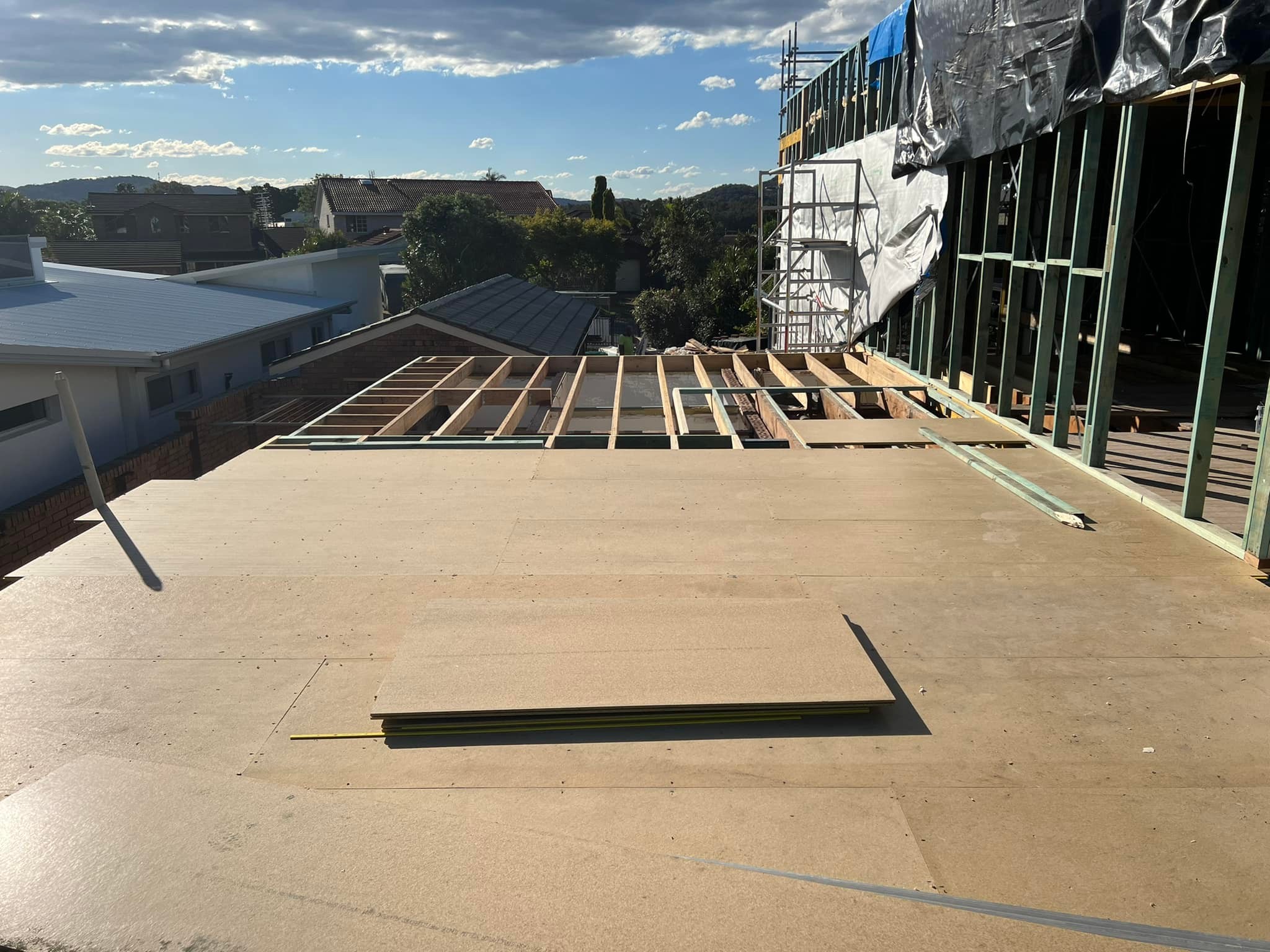 A waterfront home undergoing an upper-floor extension, including roof removal, new flooring installation, and full structural framing preparation.